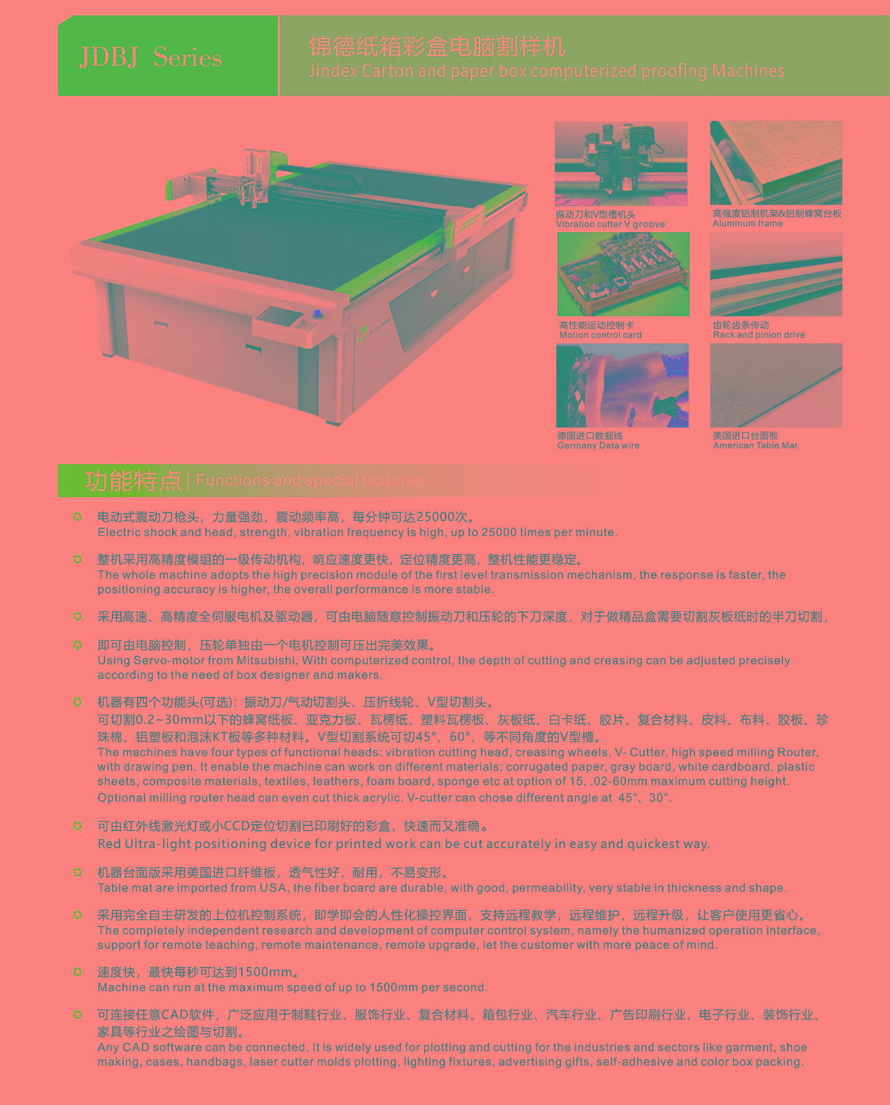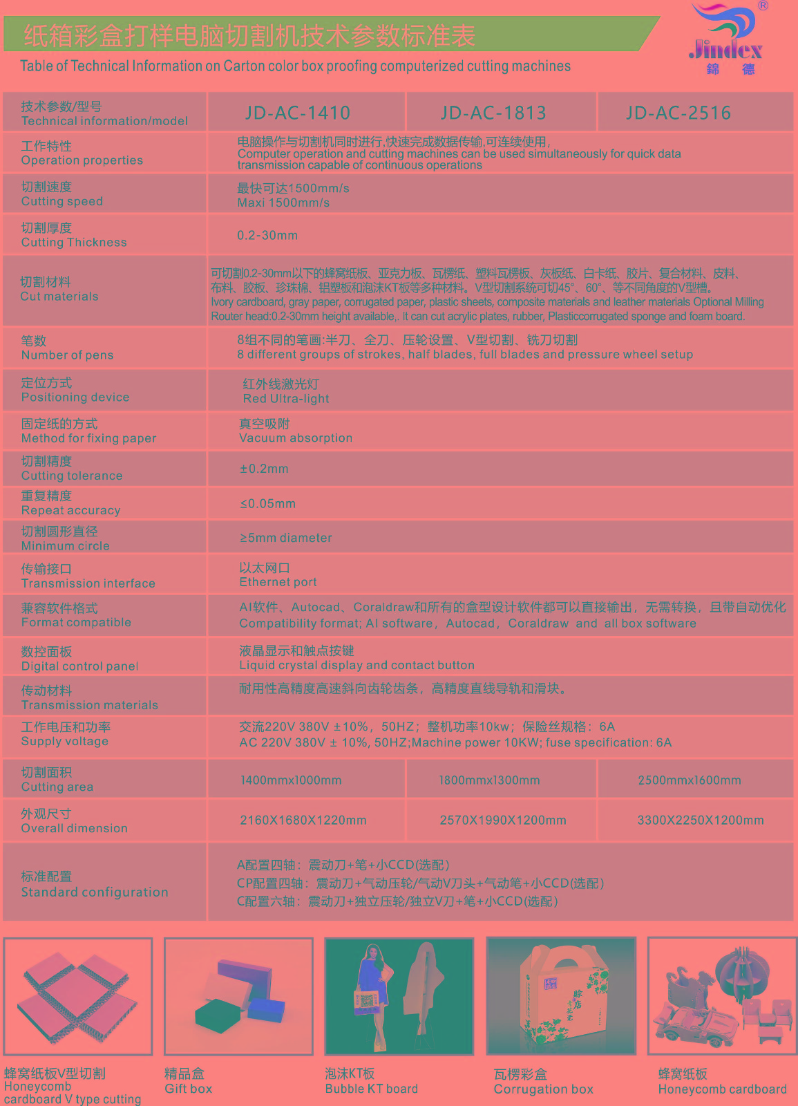錦德針對(duì)彩印包裝行業(yè)打樣及小批量定制生產(chǎn)而研發(fā)出的一款智能高速平板切割機(jī),隨機(jī)配備振動(dòng)刀、壓輪、拖刀、V切刀、泡沫刀等工具,不僅可輕松應(yīng)對(duì)各種柔性材料,如瓦楞紙、蜂窩板、卡紙、泡沫、灰板、KT板等,還可切銑各種硬質(zhì)塑料,如亞克力、PVC等??蓮V泛應(yīng)用于包裝、印刷、廣告、展示等行業(yè)。